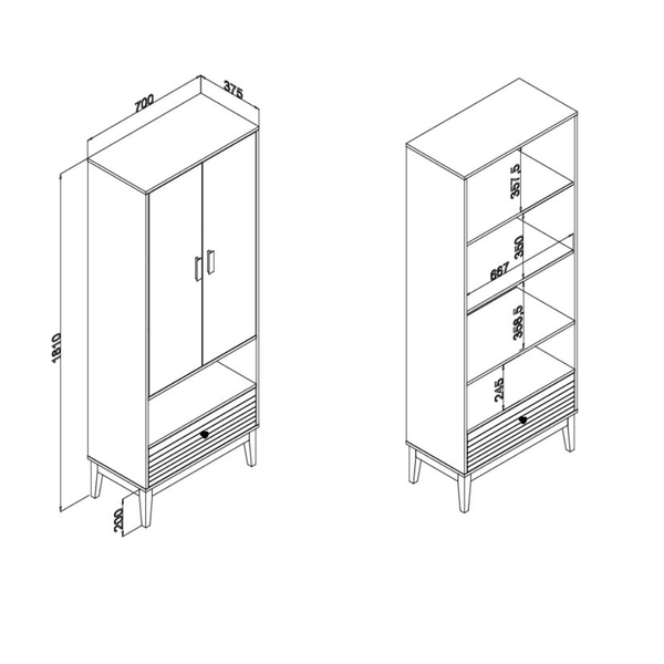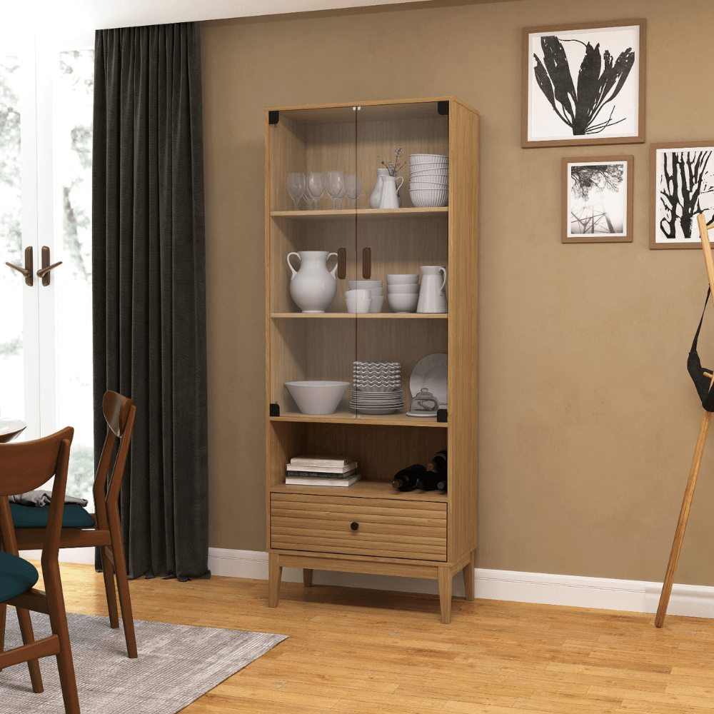 As 2 portas permitem armazenar e exibir louças, taças e objetos decorativos com segurança, enquanto a gaveta inferior é ideal para guardar utensílios, toalhas ou acessórios, otimizando a organização do espaço.