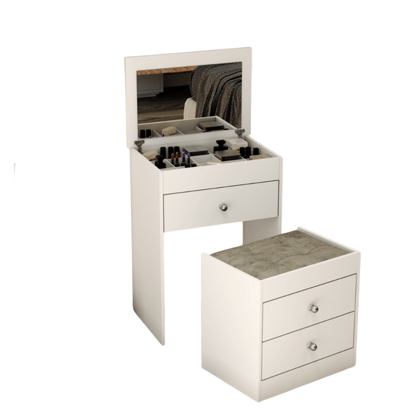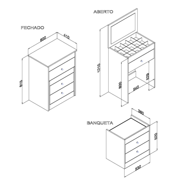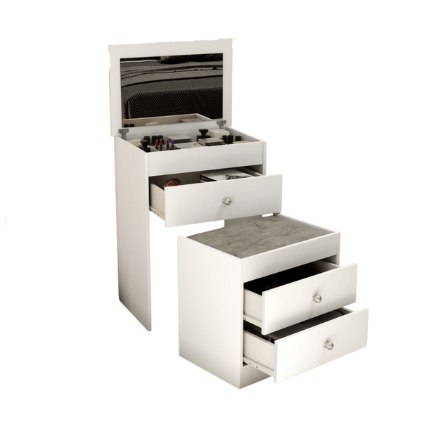 O modelo conta com espelho integrado, divisor interno de gaveta para melhor organização de maquiagens e acessórios, além de 3 gavetas espaçosas. Acompanha ainda banqueta com rodízios, garantindo mobilidade e maior comodidade durante o uso.